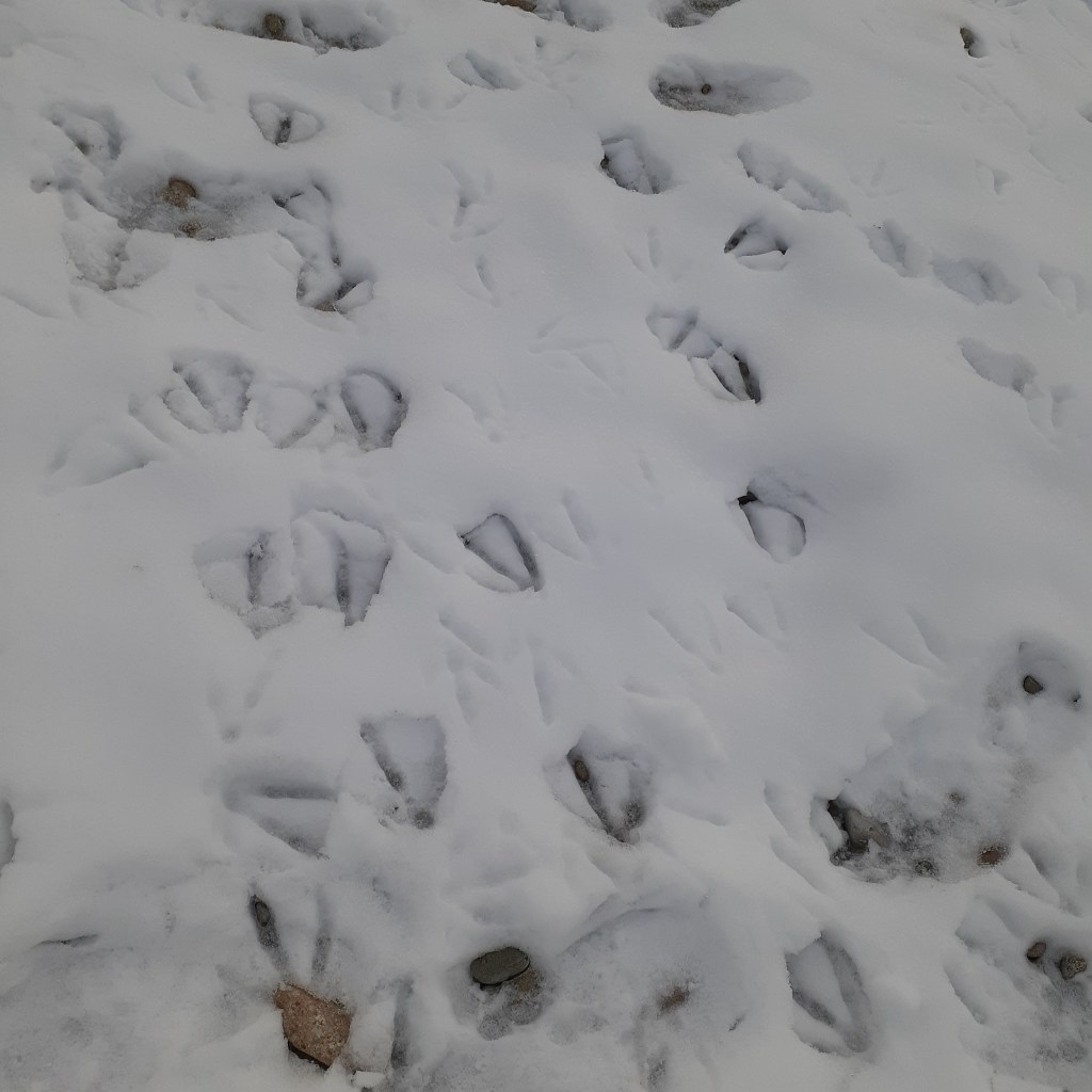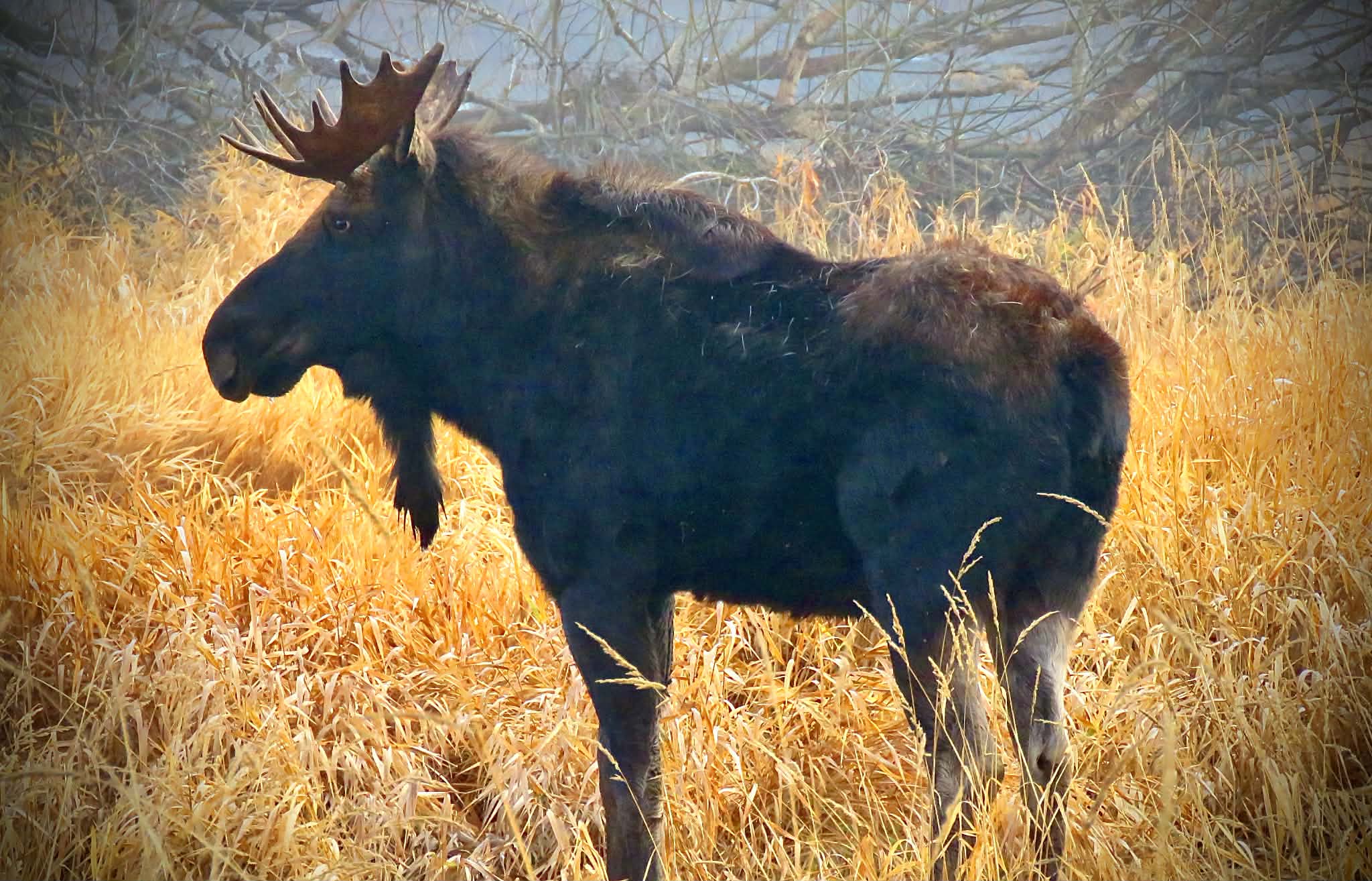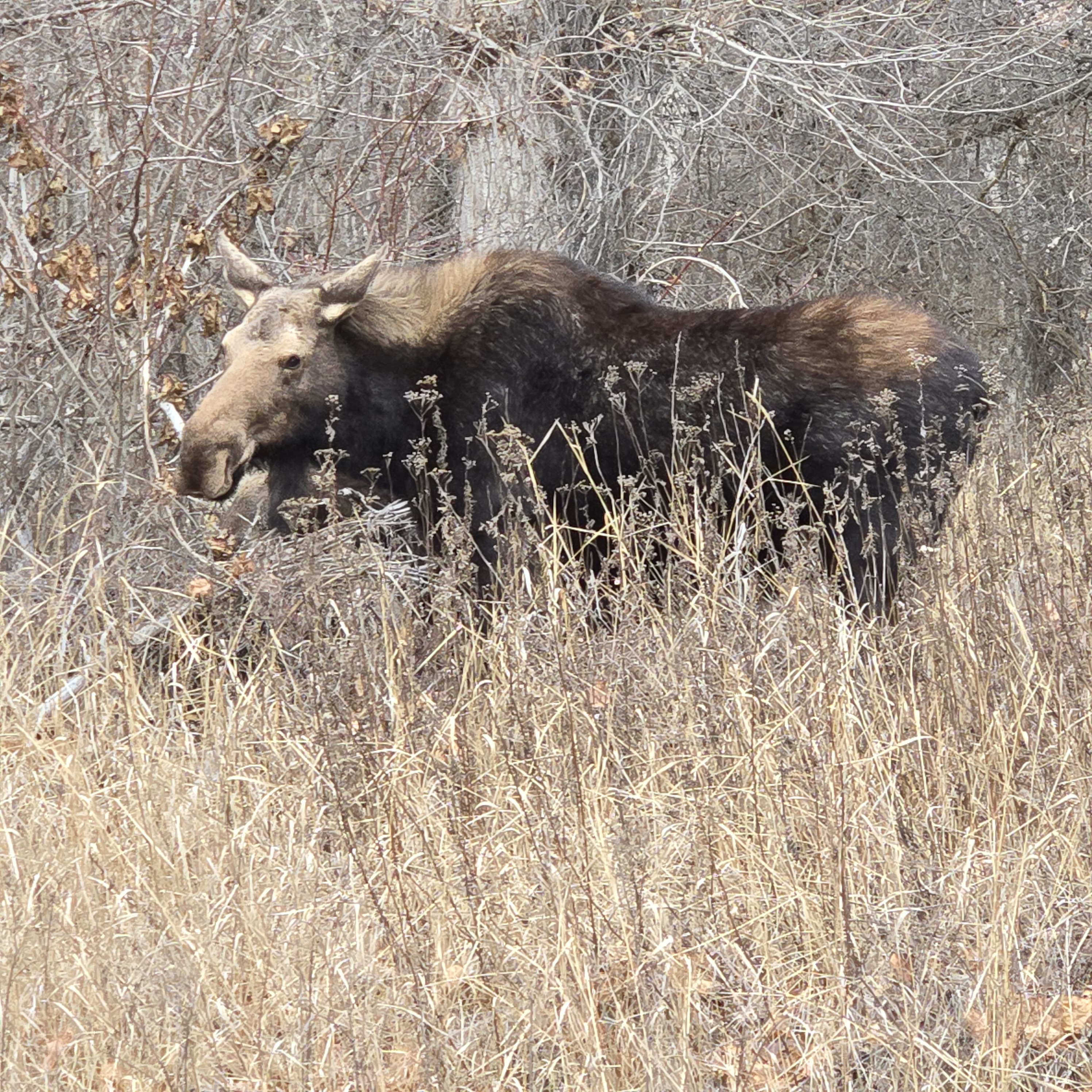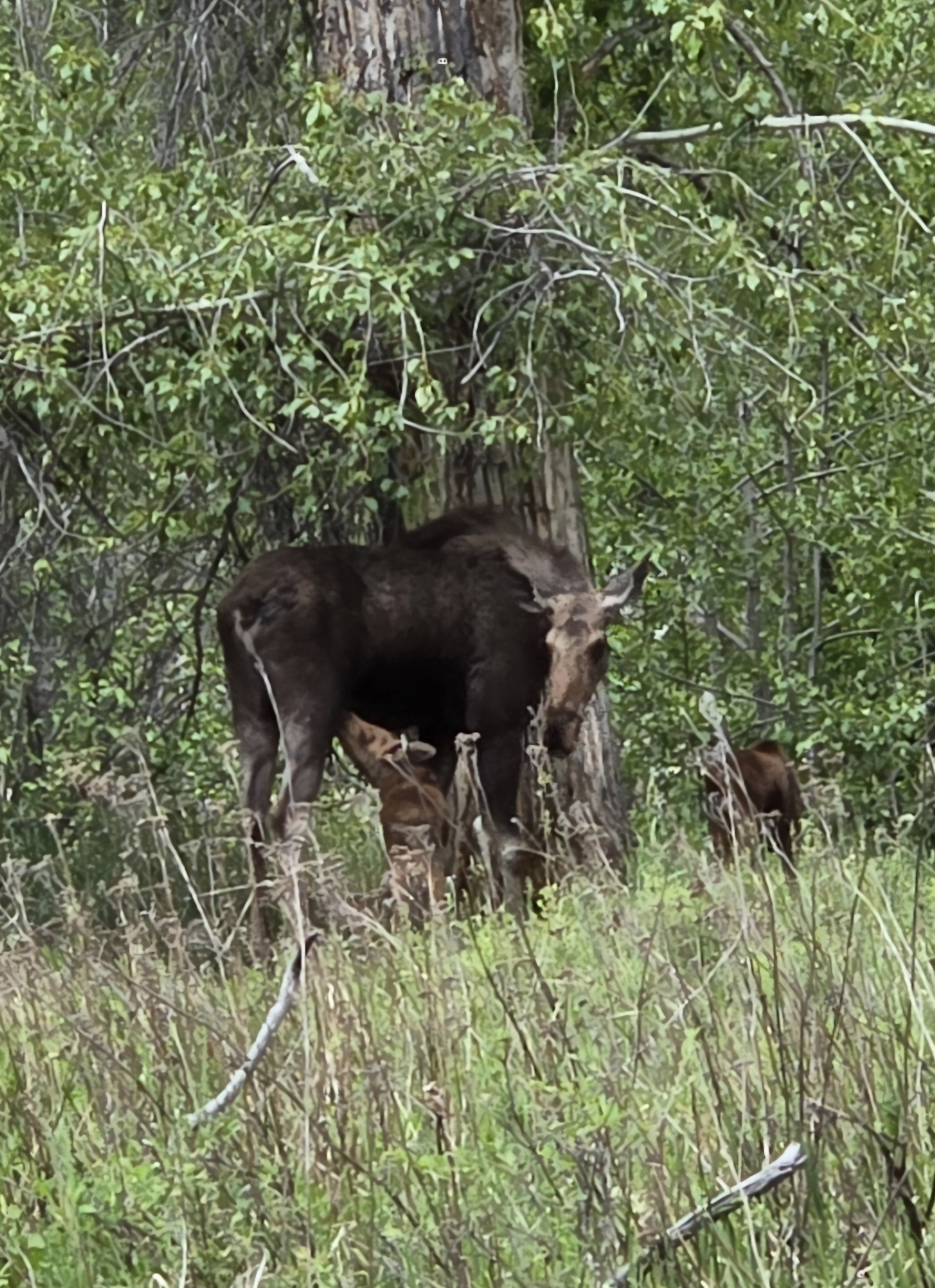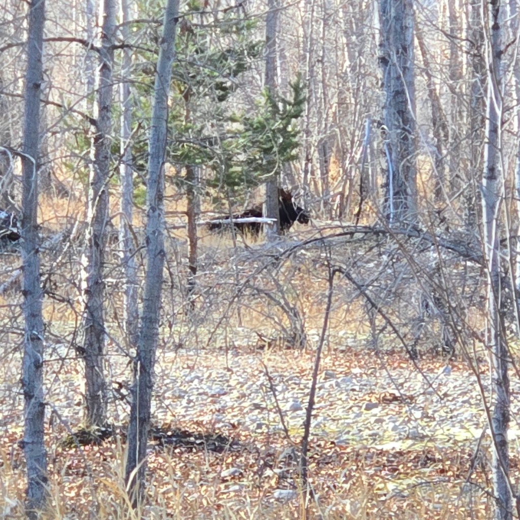 Though I can go months without seeing one, mid-winter through April and maybe none in late summer, they make up for it the rest of the time. They are big and dark but can be hard to see. In the spring it’s mamas and babies, sometimes twins! Often times it’s just cows. In the fall there are more bulls, but always cows and yearlings to watch. The males have especially big “bells” or dewlaps hanging off their necks. Just goofy.