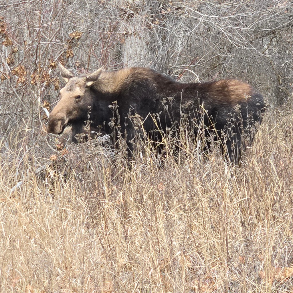 I had no idea that this is moose heaven, for them and for people like me. The river areas and all the adjoining parks are home to them. I got here in October and saw my first one in April, posing nicely in an area that, since then, I have probably seen more than 10. Hard not to get hooked. I have a new walking buddy, Ralph, and he’s as addicted as I am.