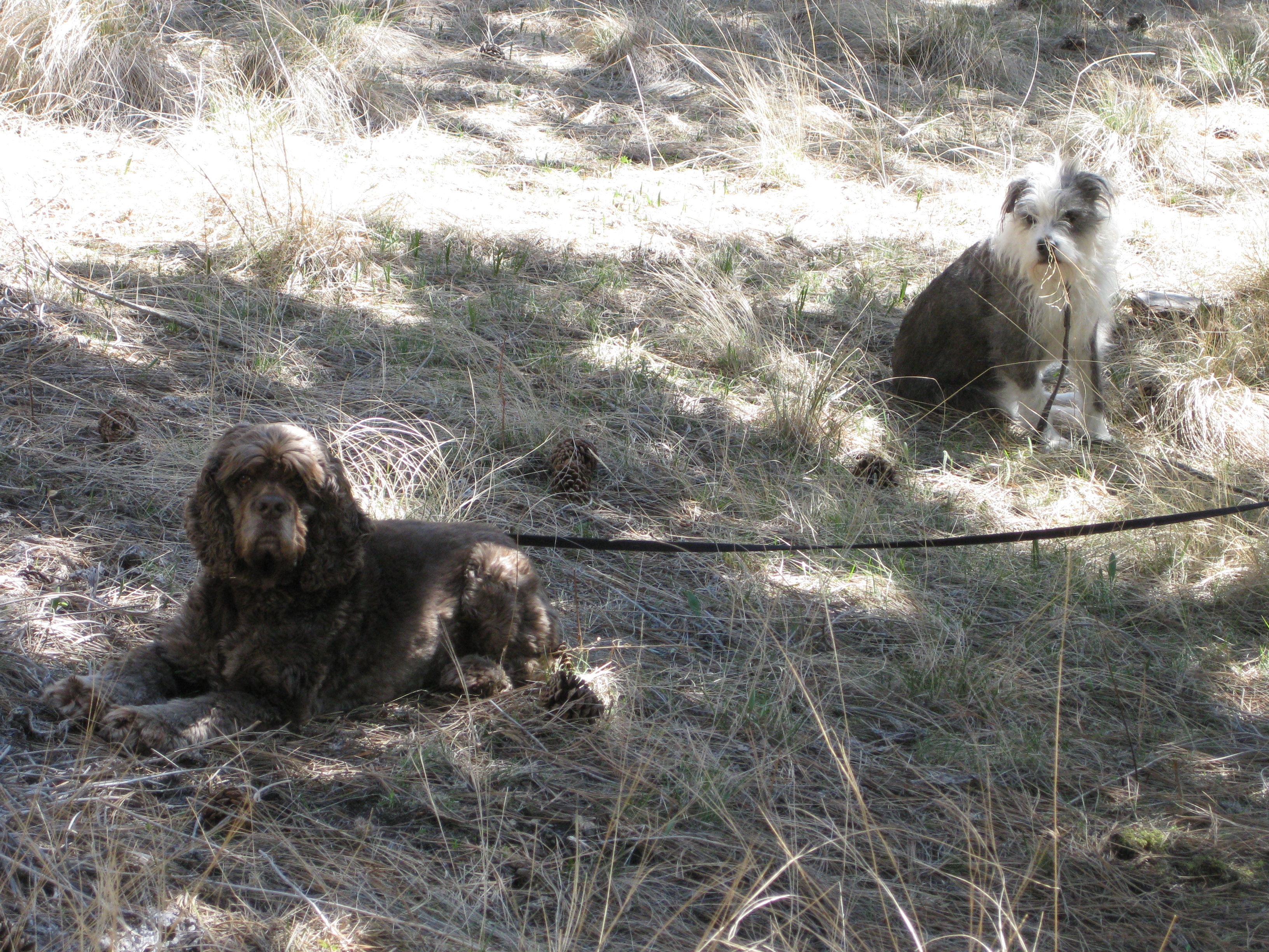 Luckily I finished most of my burning and spring yard cleaning before the winds came, including collecting all the puffs of polyester filling scattered around the dog yard – remnants of shredded Christmas dog toys that had been buried under numerous snow falls. Neighbors would certainly wonder what those were if they saw them blowing across their yard. With all the raking and burning, the only contribution made by the dogs was their sweet company, though sometimes a little grumbly at having to be tied up out in the wind. Notice Coop’s winter coat – he’ll be shaved into his summer coat next week, he’ll look totally different.