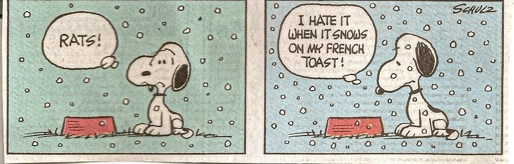 Poor Snoopy Posted on February 20, 2015 by Cynthia Doll Snoopy may be upset but I can’t complain about the gentle snow we’re having – the first in weeks and not too threatening. And me and my kids eat our French toast inside 😀 Share this: Click to share on Pinterest (Opens in new window) Pinterest Click to share on Facebook (Opens in new window) Facebook Like Loading... Related