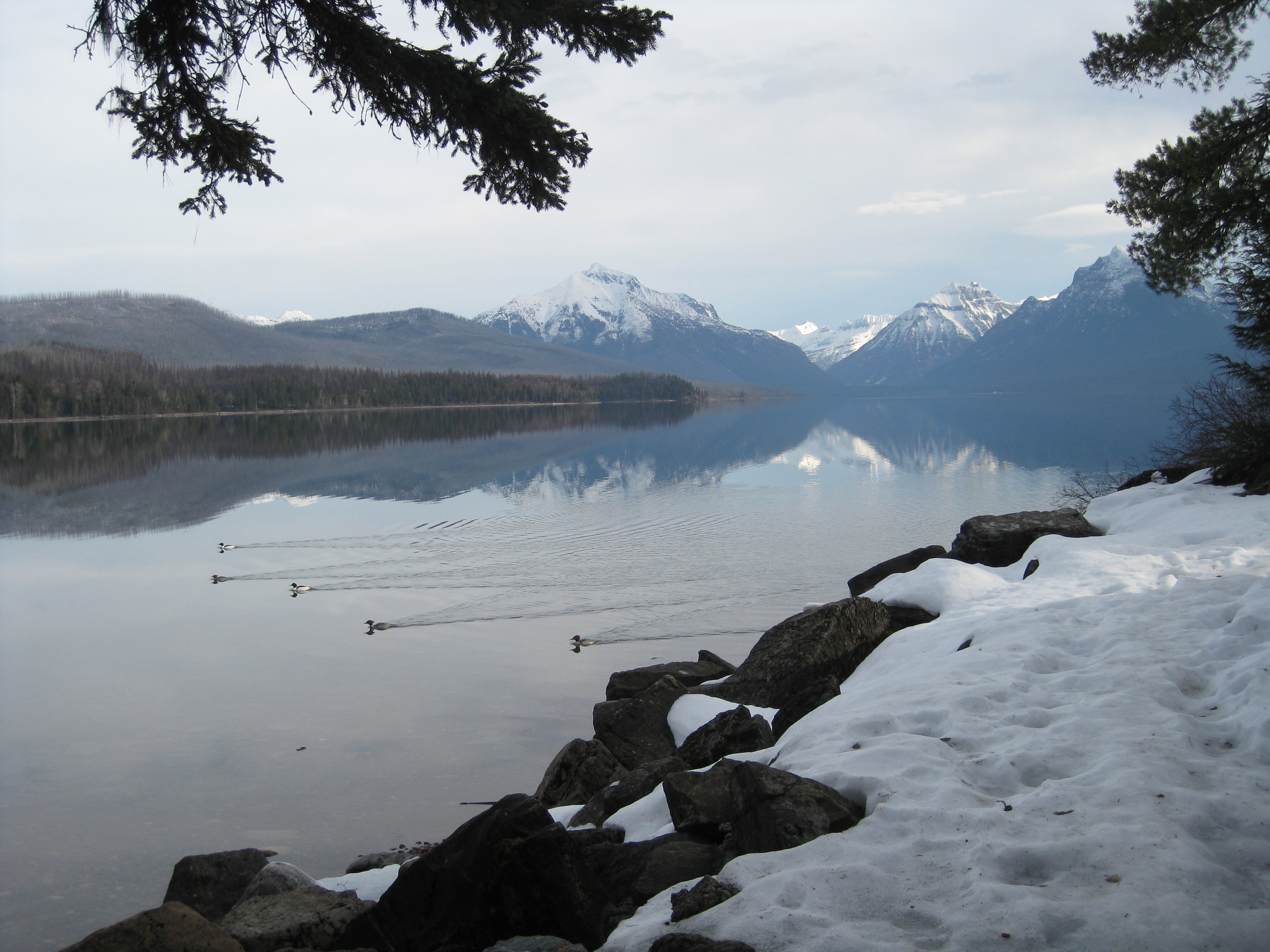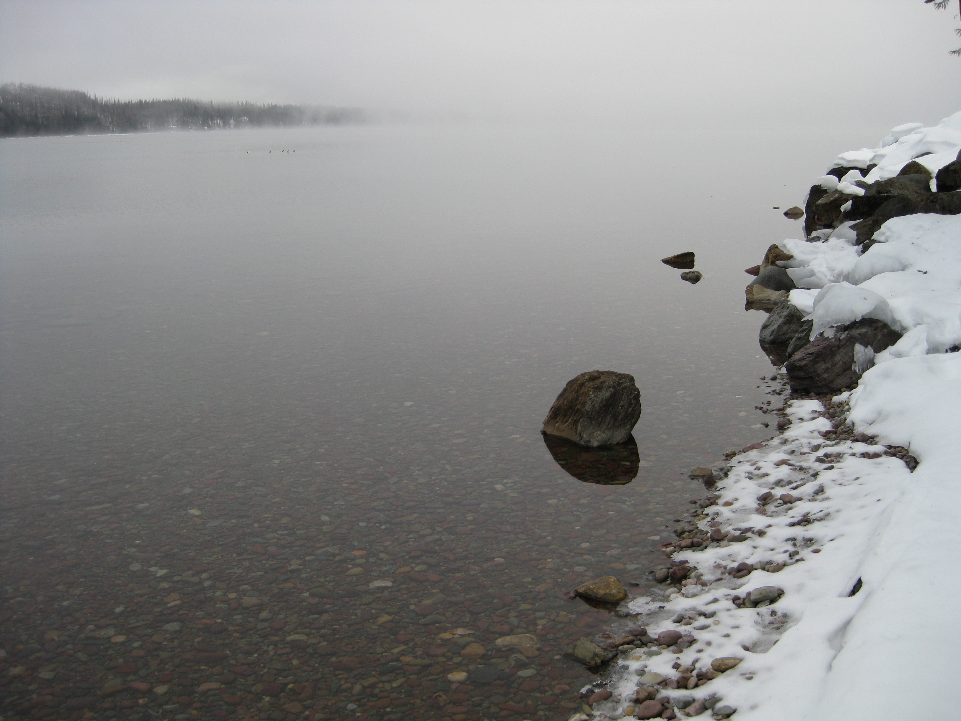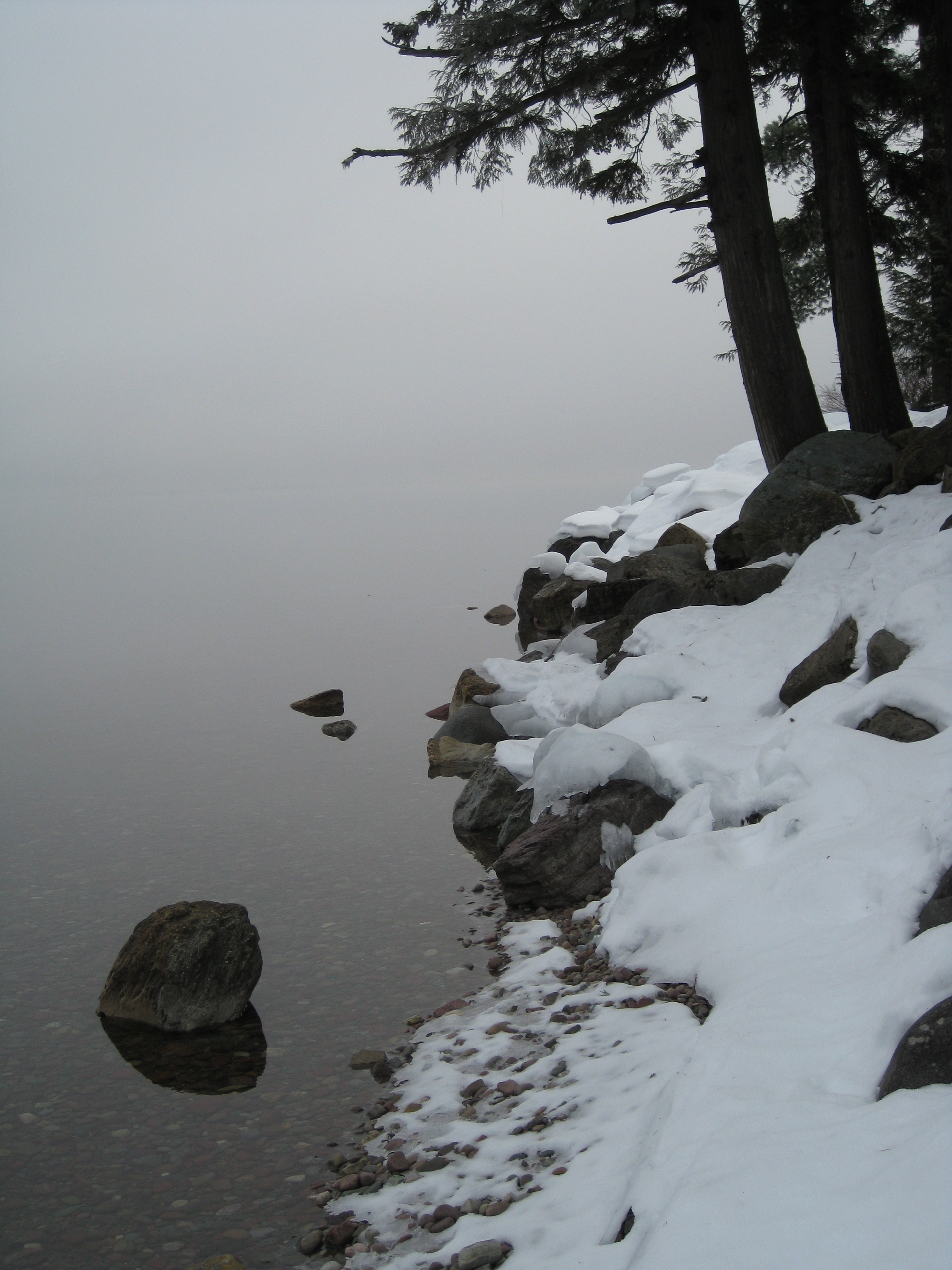 Yesterday I drove another group of kids up to Glacier Park for snowshoeing. Still lots of snow and ice but much warmer and prettier, unless you prefer fog. The ice was doing weird things – I’ve never seen ice form like this, must be from waves? Chunks ranged from 1 inch to about 6 inches and some made great skipping stones:
