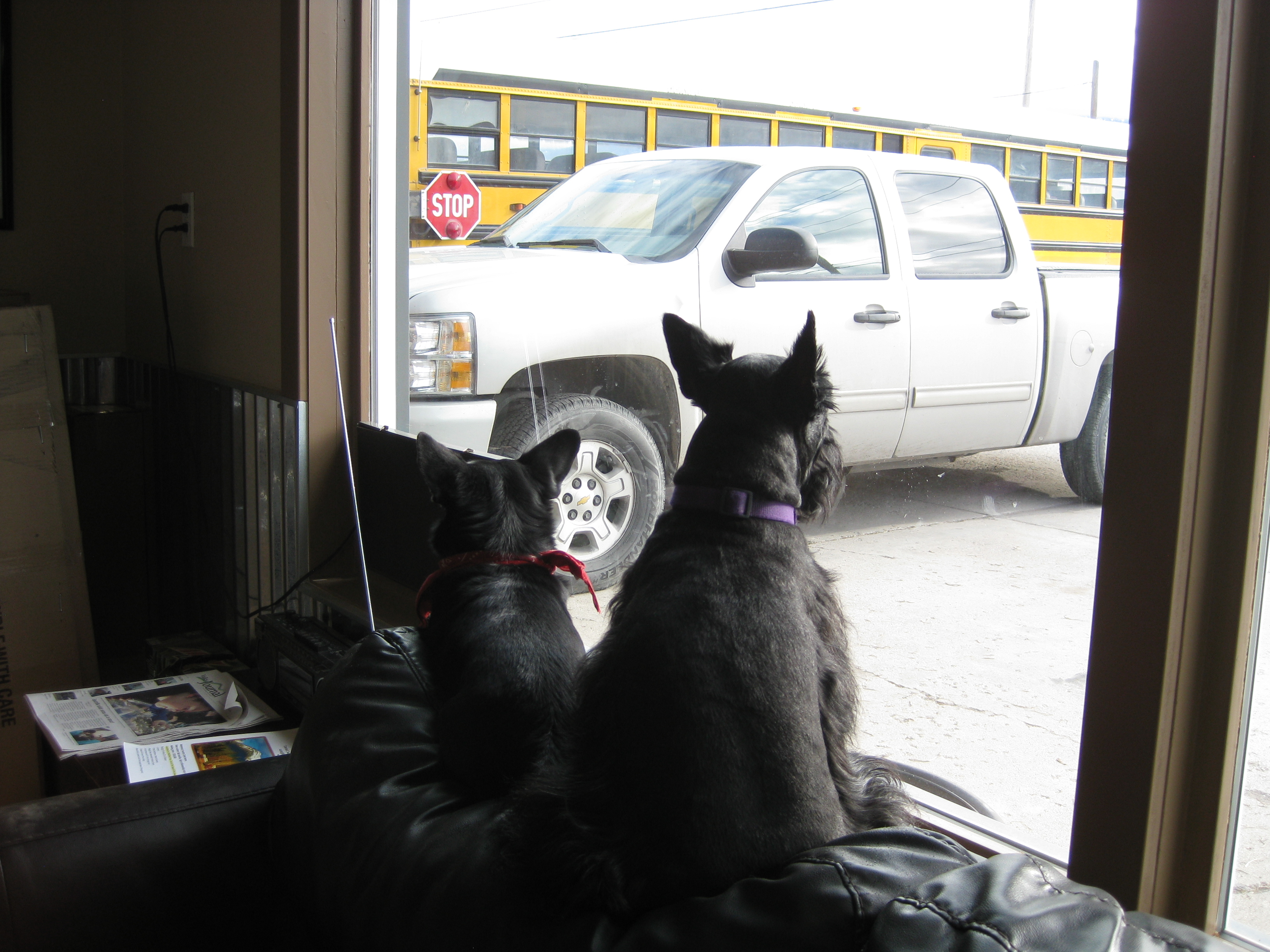 Life is pretty quiet up here, not much to report. I dropped my bus off yesterday to get some painting done on it and, lucky me, while I waited for a ride home I had the company of two doggies who had designated spots on the couch to watch the scenery. Both were in and out of my lap at one point or another. Later I drove some kids to the aquatic center and watched typical spring squalls of corn snow blow around by the mountains.
