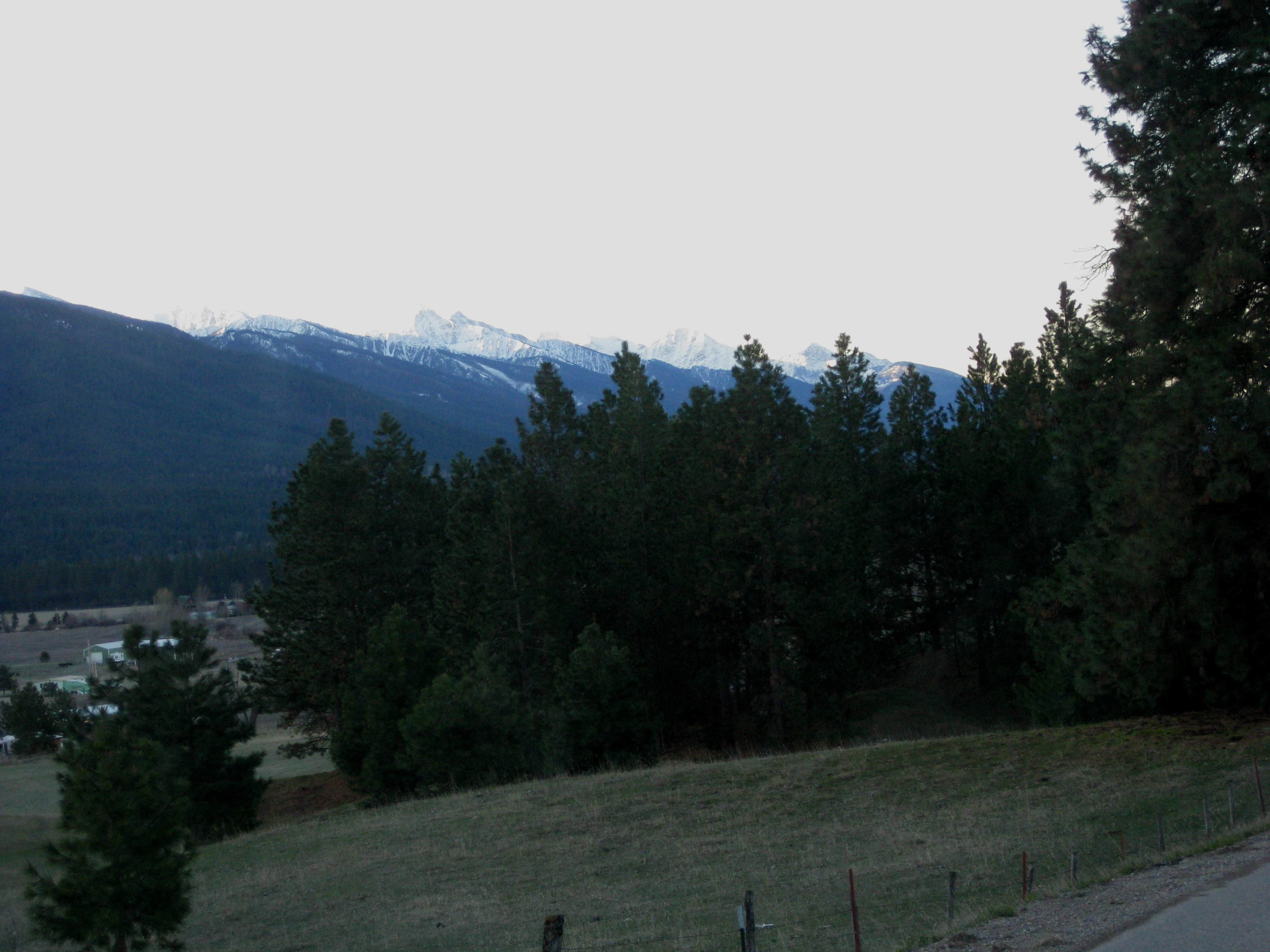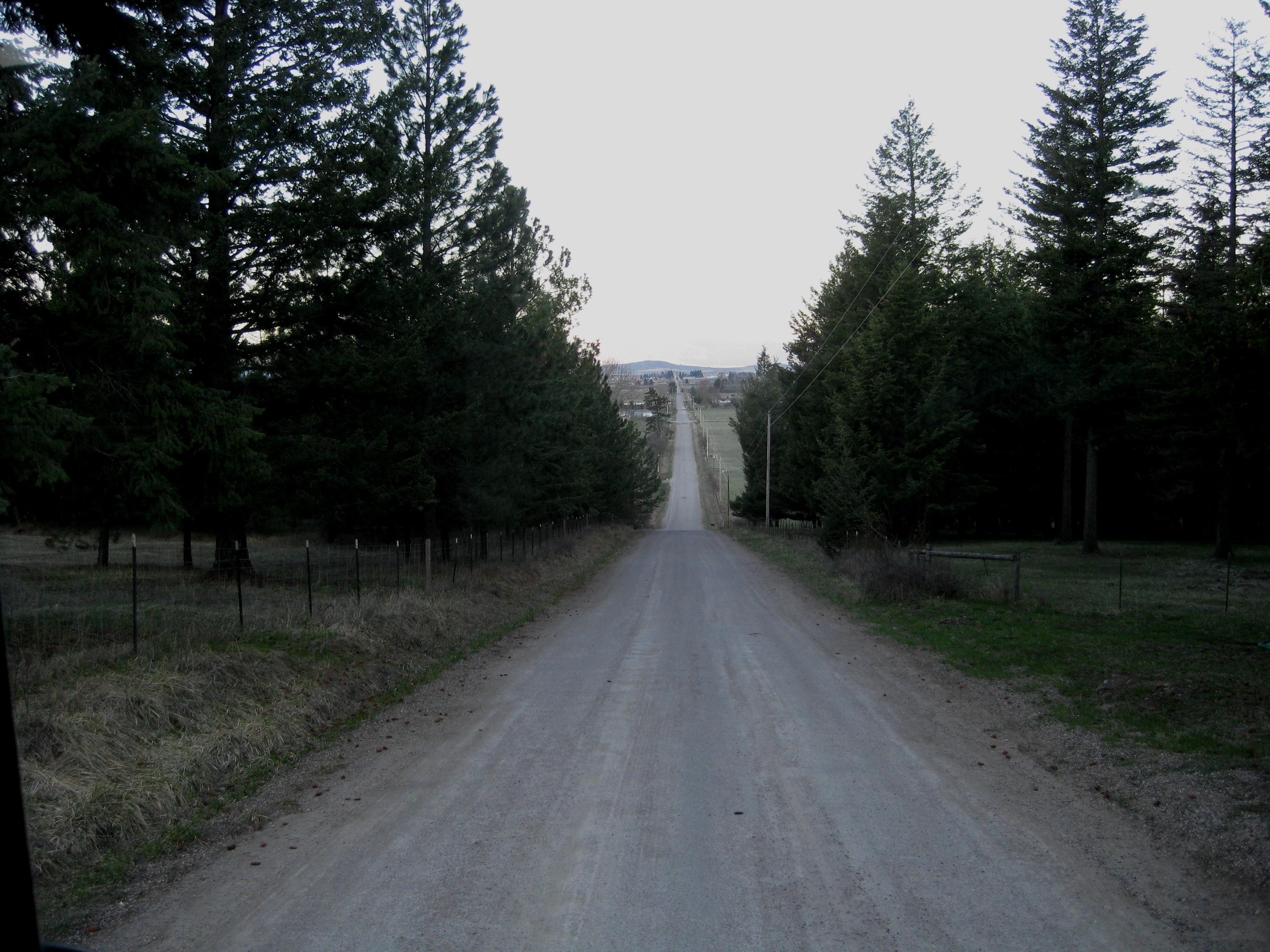 I’ve become friends with the mom who waits with my first pickup, and now I do my waiting there. The road ends there, tapering down to a trail leading into the woods at the base of the mountains. She brings her Yorkie and we chat and I cuddle the pup and then Zack and I get on our way. Before heading out the other day I took a picture at the top, and one of Zack, looking down a steep block or so and out into the valley. In the distance are the Salish Mountains, kinda hard to see, and I just missed them being rosy, but this gives an idea. My house is tucked in those hills. It’s looking the other way than the shot from the grain bins. I often have to wait for deer to get out of the way at the end of this road or for turkeys to figure out how to get through or around fences so I can pass.