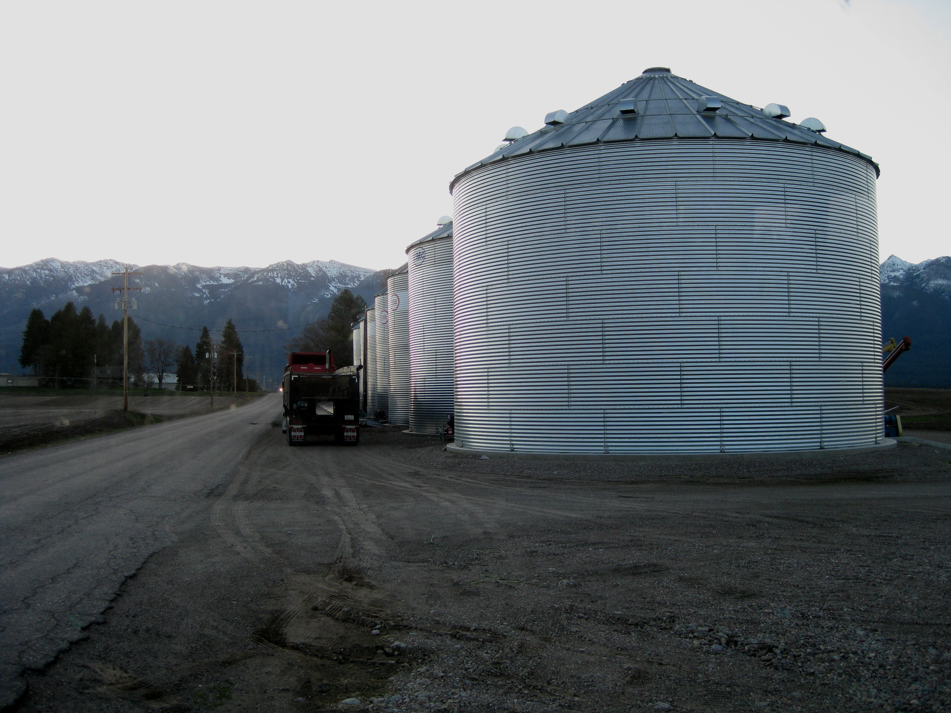 My first waiting spot is along a long straight road heading into the mountains, surrounded on both sides by farms – grain, potatoes, and I don’t know what else. If I was early I had been waiting by these grain bins, often parked with potato trucks ready to load or full and ready to head out.