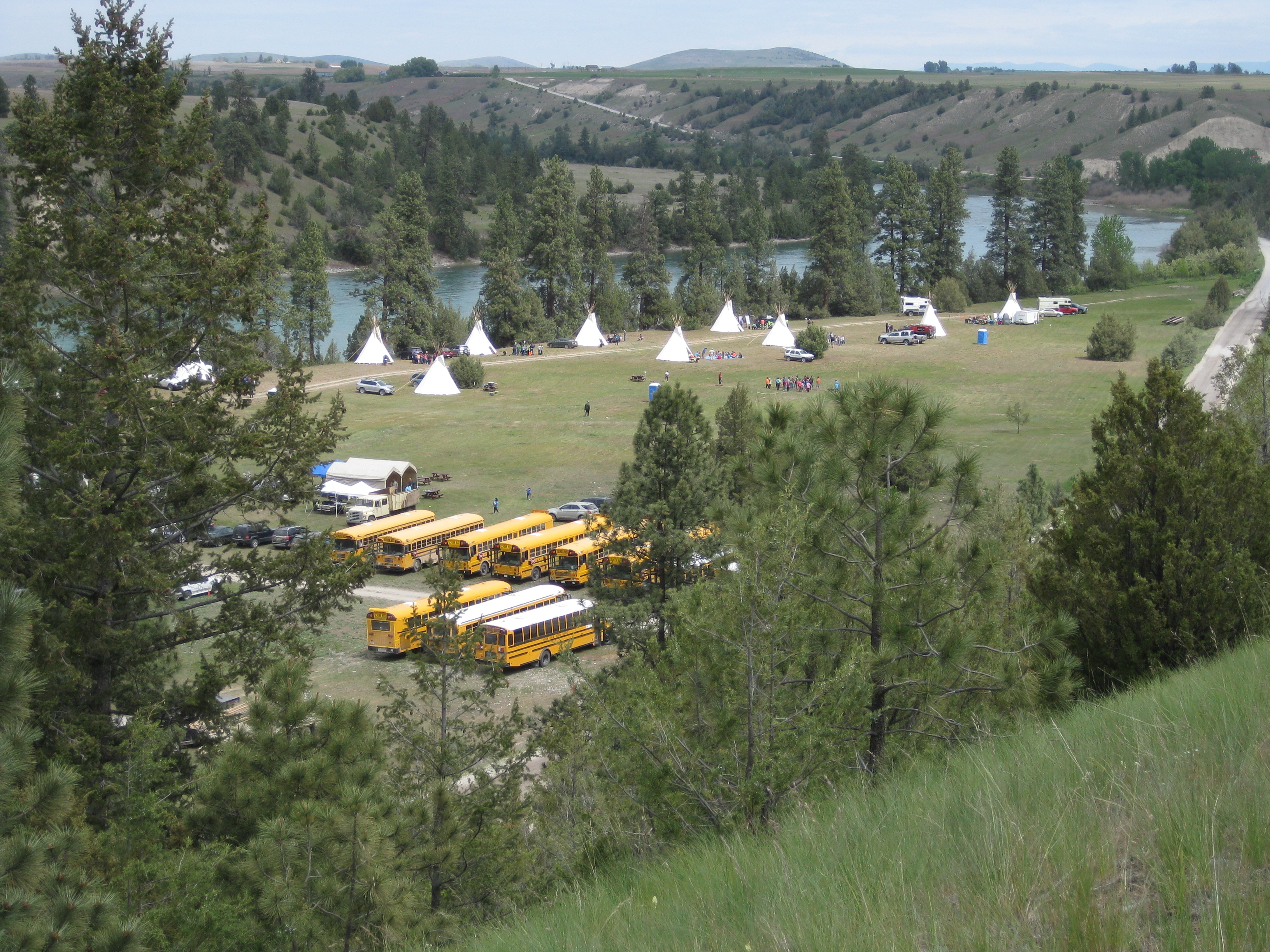 Last week was river honoring for the Salish and Kootenai tribes. There is a lovely spot along the Flathead River set up for sharing and educating local school kids each May. There was a tipi for each of, I believe, ten “stations” where students could learn fish and water bug identification, about local trees, Native American stick games, about power provided by our local dam, and touch animal hides and bones brought by the Forest Service.