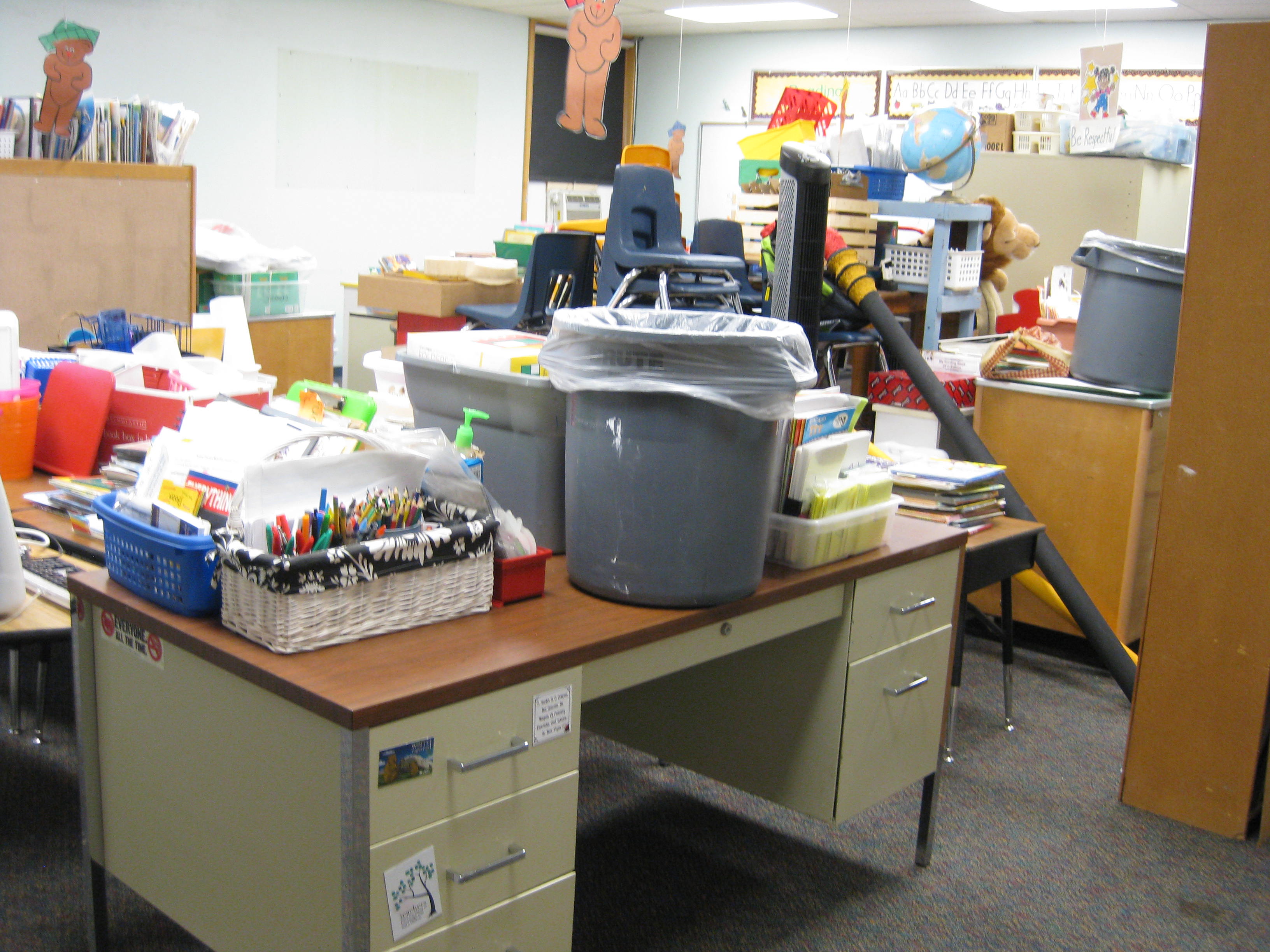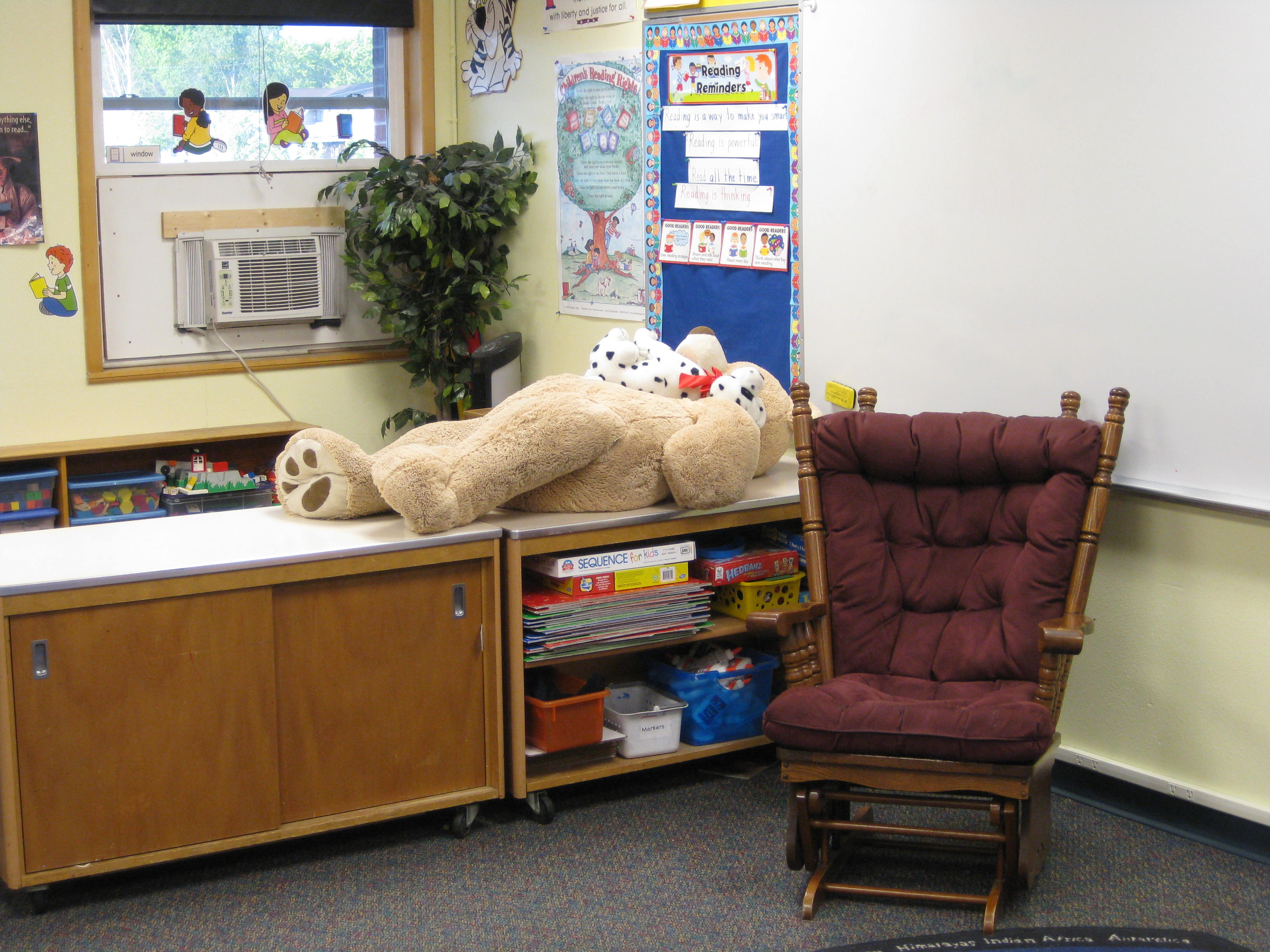 In the process I’ve rescued triceratops from a market awning, had a runaway teddy heading for the cafeteria, corralled out of control glue sticks, cleaned up a major train wreck in a hallway and woke up a sleeping bear.