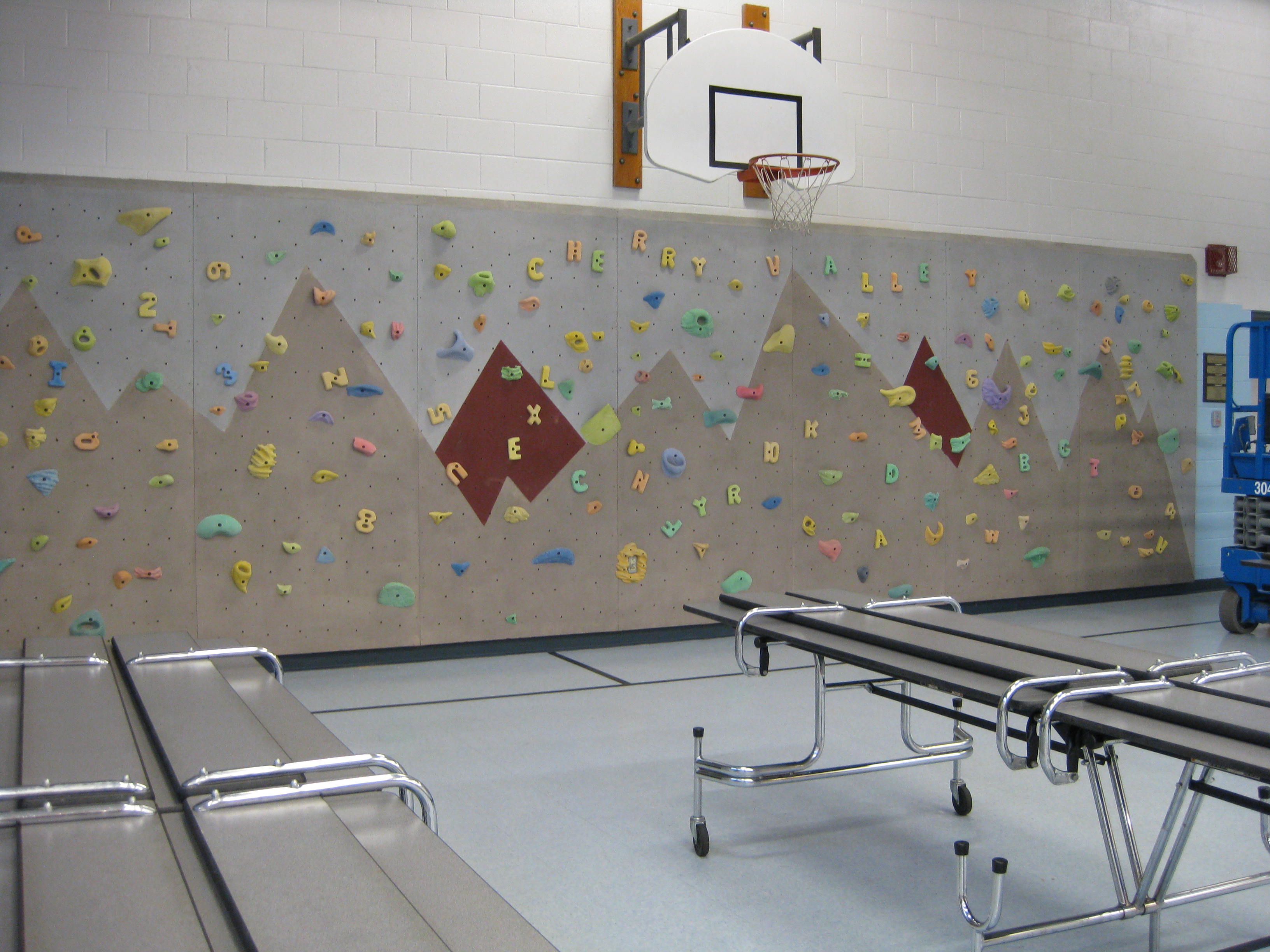 I washed every exterior window on that building, including ones on the roof looking into the cafeteria, and most of the interior ones. There aren’t as many on the south side of the school but enough. One of the other hard workers removed all the hand and foot holds off this climbing wall in the cafeteria/gym.