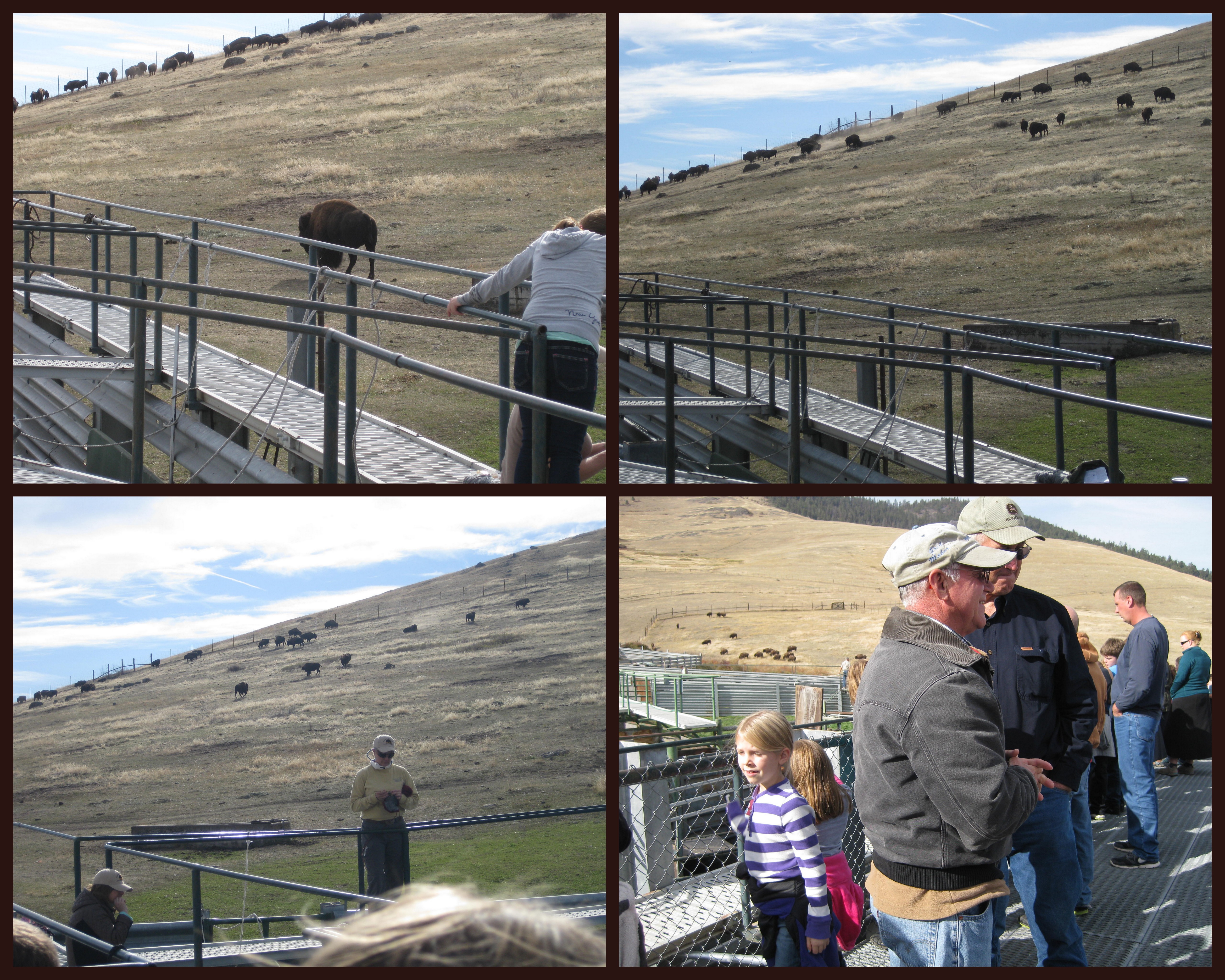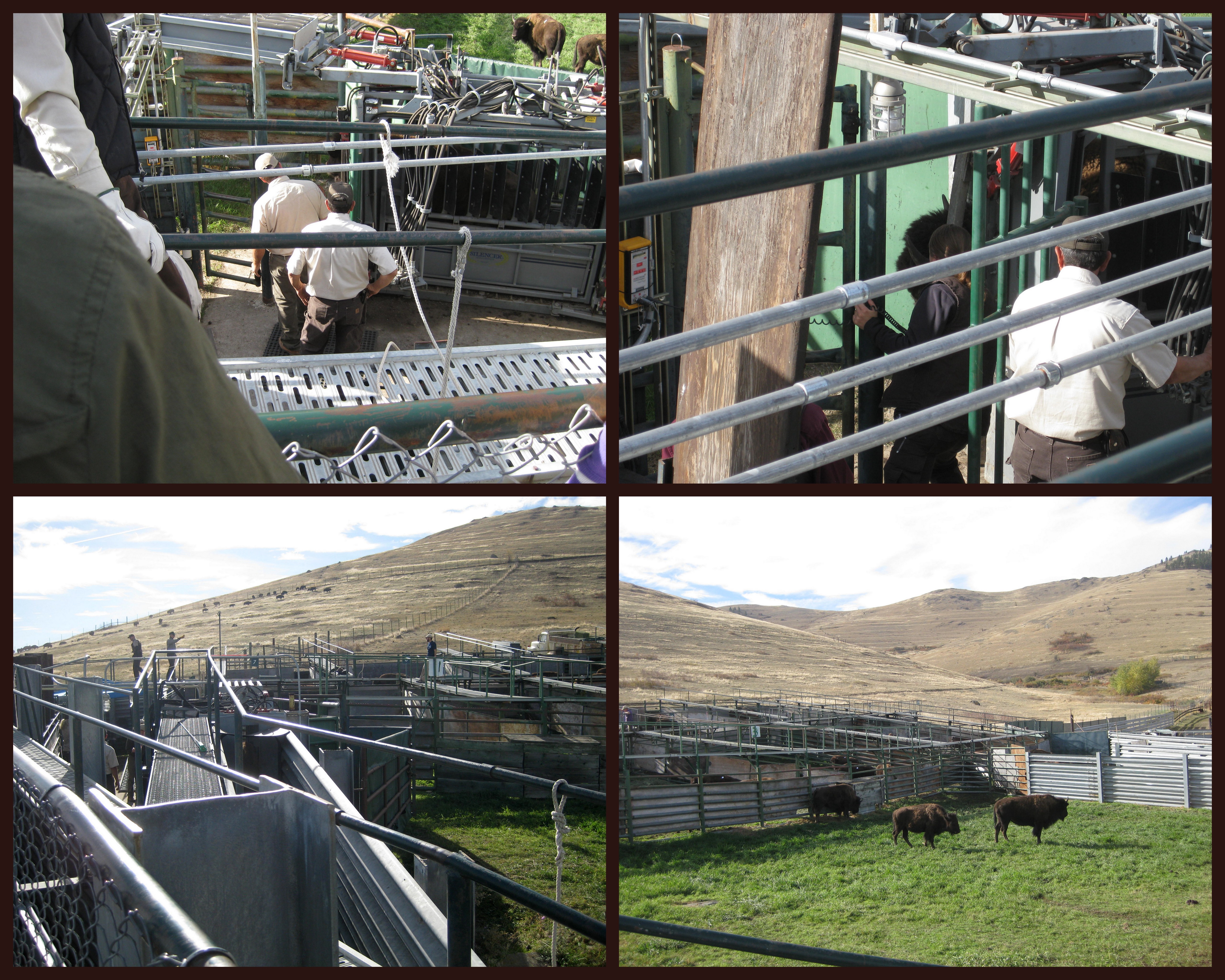 The first Monday and Tuesday of October the bison range invites the public to come watch the annual bison roundup. LOTS of school children accept the invitation. When I went a few years back they still did the roundup with cowboys on horseback, but now they use Jeeps and ATVs; it’s just not the same. Supposedly it’s less stressful to the bison, and certainly safer for the cowboys. Anyway, there’s a big holding area and numerous smaller ones with gates and chutes for moving the big critters through the process of being chipped, weighed, inoculated, DNA tested, separated, or anything else that needs done. This is the time they separate out those that will be shipped to other herds or tribes.